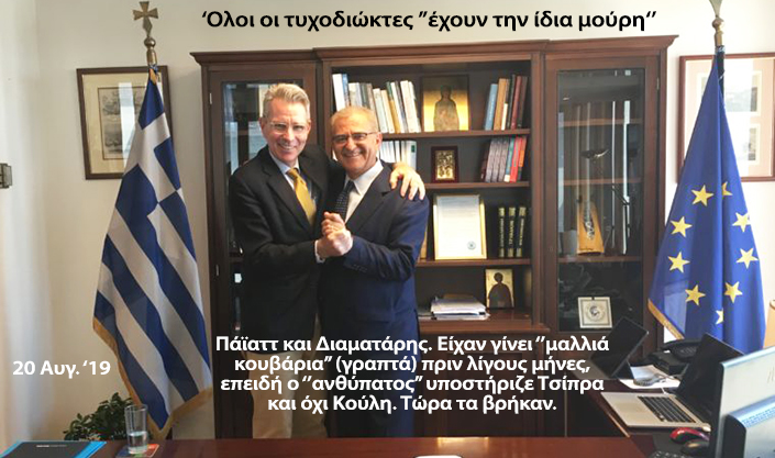 Και σε ότι αφορά τον... ''μακεδονομάχο'' υφυπουργό και τώρα ''κωλοτούμπα'', δεν χρειάζονται σχόλια. Ούτε γιά τα καραγκιοζιλίκια με τον ''υποστηρικτή του Τσίπρα'' πρέσβη Πάϊαττ, τις ''μάχες'' υφυπουργού-πρέσβη πριν ολίγους μήνες και τις αγκαλιές, τώρα.