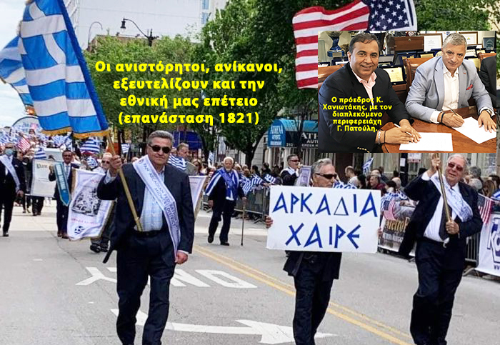 Αν ο -χωρίς παιδεία- ανίκανος πρόεδρος της νεκρής ελληνικής Ομοσπονδίας Συλλόγων Ιλλινόϊς δεν ήταν ανιστόρητος και της απραξίας και αν οι του Συμβούλιου δεν ήταν ''τα ίδια και χειρότερα'', δεν θα ατιμούσε η Οργάνωση την εθνική επέτειο, βάζοντας τελετάρχες ''πολιτικάντηδες β' κατηγορίας'' σαν τον Γιαννούλια και τον Ζεμενίδη, γιά ικανοποίηση τοπικών διαπλεκόμενων προσωπικών συμφερόντων προέδρου και άλλων, αλλά θα έκανε το αυτονόητο, γιά να τιμήσει πραγματικά την Επανάσταση 1821. Θα καλούσε γιά τελετάρχες, άξιους να τιμηθούν.