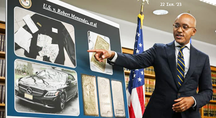 Ηταν αναμενόμενη η δίωξη του γερουσιαστή Μπομπ Μενέντεζ (Δημοκρατικός, Νέα Υερσέη), γιά ''διαφθορά, χρηματισμό'' (το ''Κ'' την είχε προβλέψει από Δεκέμβριο '22). Ακόμα και επιφανείς Δημοκρατικοί του ζητούν να παραιτηθεί από γερουσιαστής... (Το επίσημο κατηγορητήριο των ομοσπονδιακών αρχών)